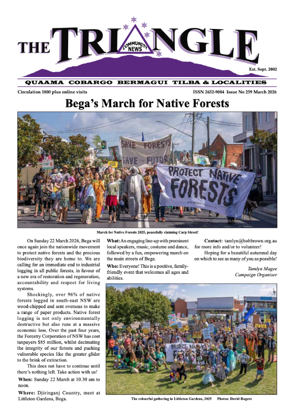 The Triangle is a community paper, principally for the region bounded by the three prominent mountains: Peak Alone, Gulaga and Mumbulla. It is produced on the traditional lands of the Yuin nation and we acknowledge that this was and will always be Yuin Country. We are grateful for their thousands of years of careful and deliberate stewardship of Country and pay our respects to Yuin Elders past, present and emerging.