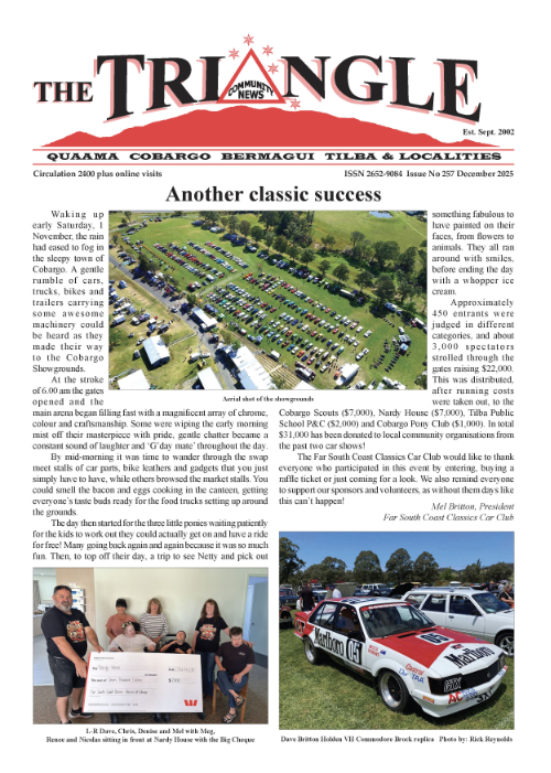 The Triangle is a community paper, principally for the region bounded by the three prominent mountains: Peak Alone, Gulaga and Mumbulla. It is produced on the traditional lands of the Yuin nation and we acknowledge that this was and will always be Yuin Country. We are grateful for their thousands of years of careful and deliberate stewardship of Country and pay our respects to Yuin Elders past, present and emerging.
